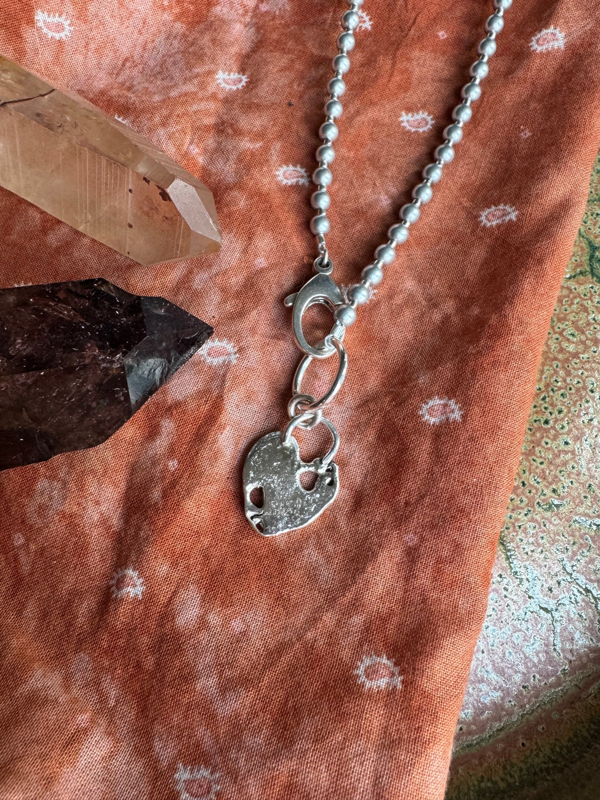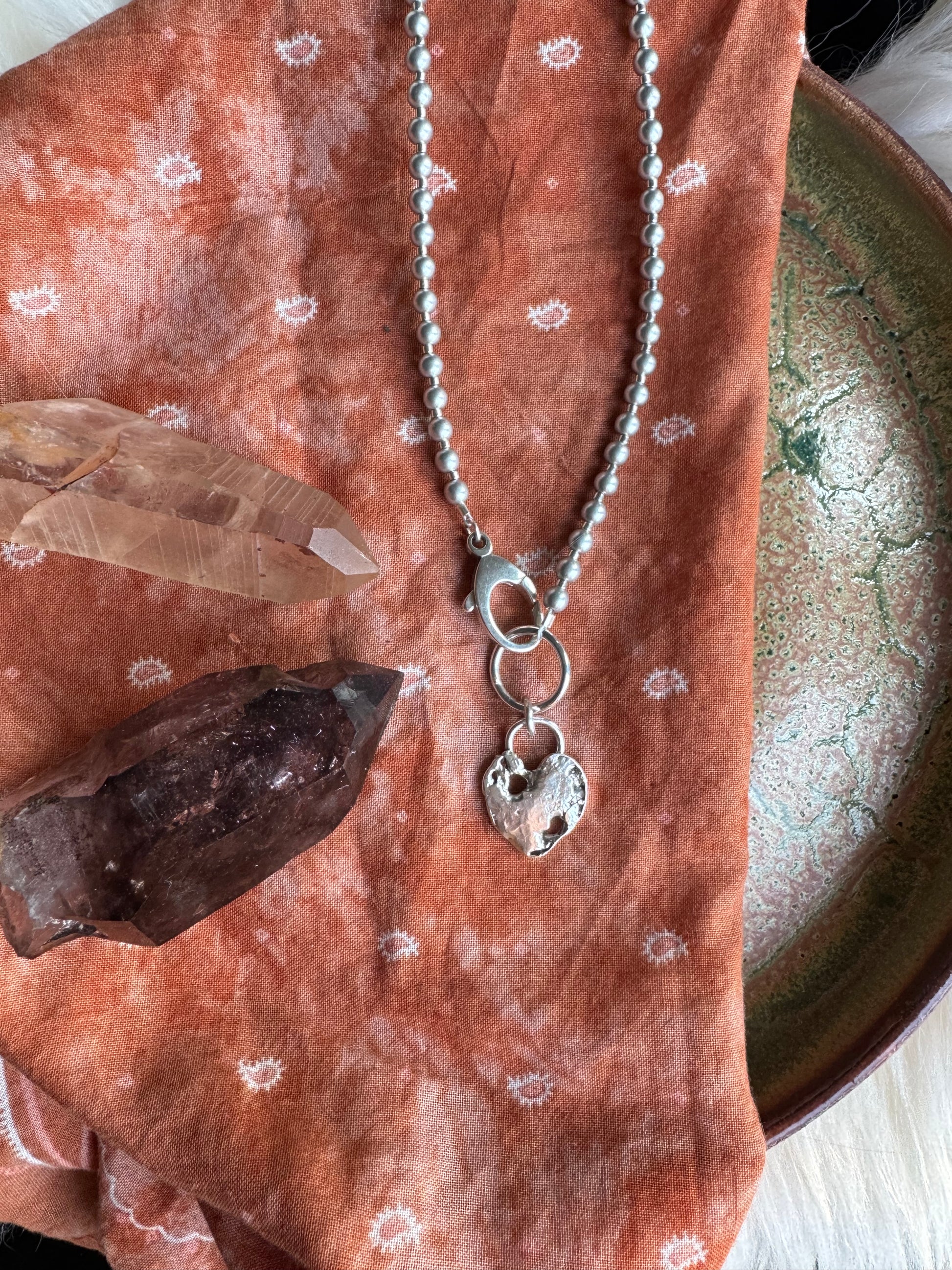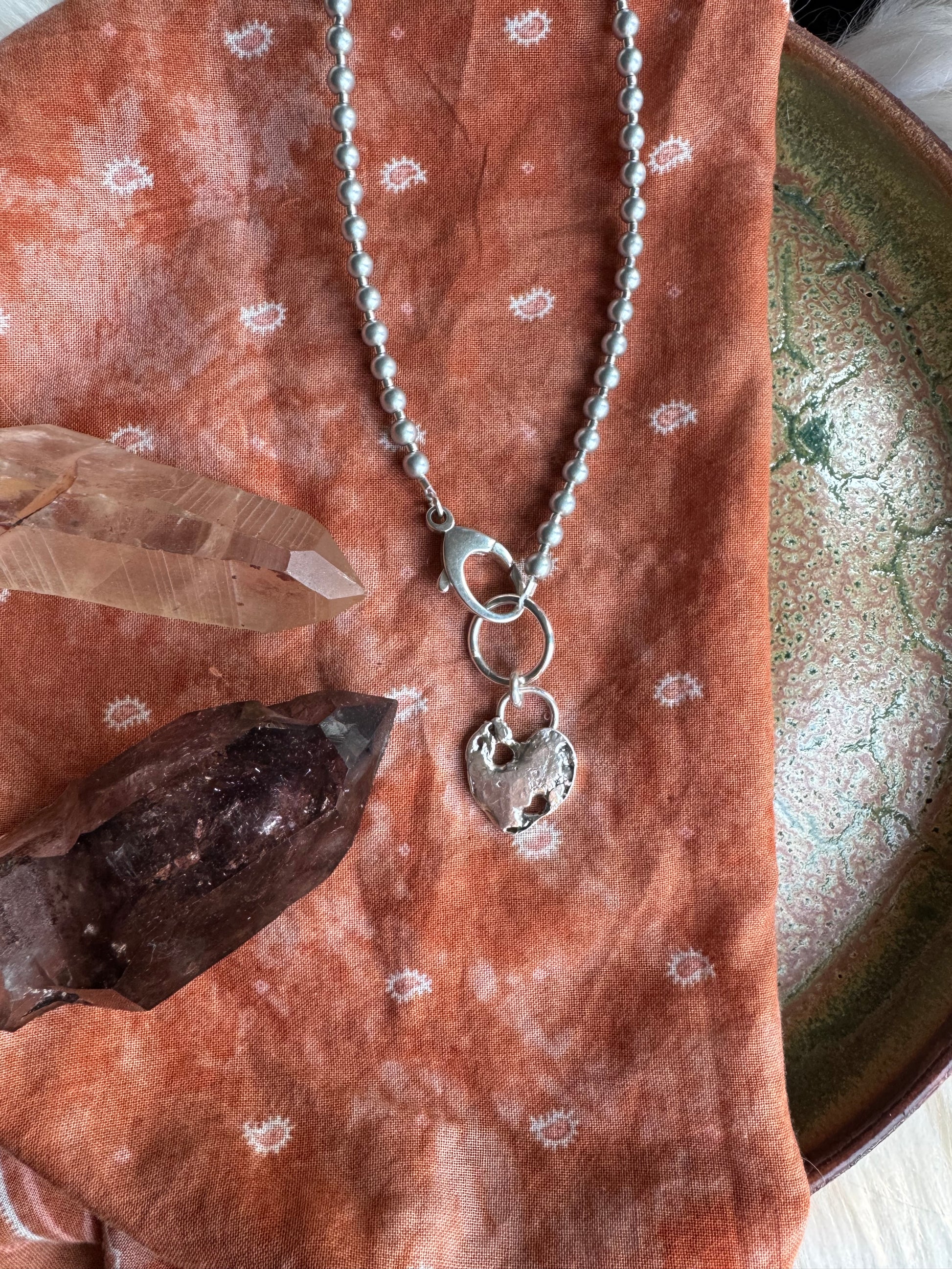 Made with sterling scraps, and very imperfect, a heart with gaping holes hangs on a 16" hand beaded necklace. Beads are not sterling. Big statement sterling clasp at front. LOVE this look.