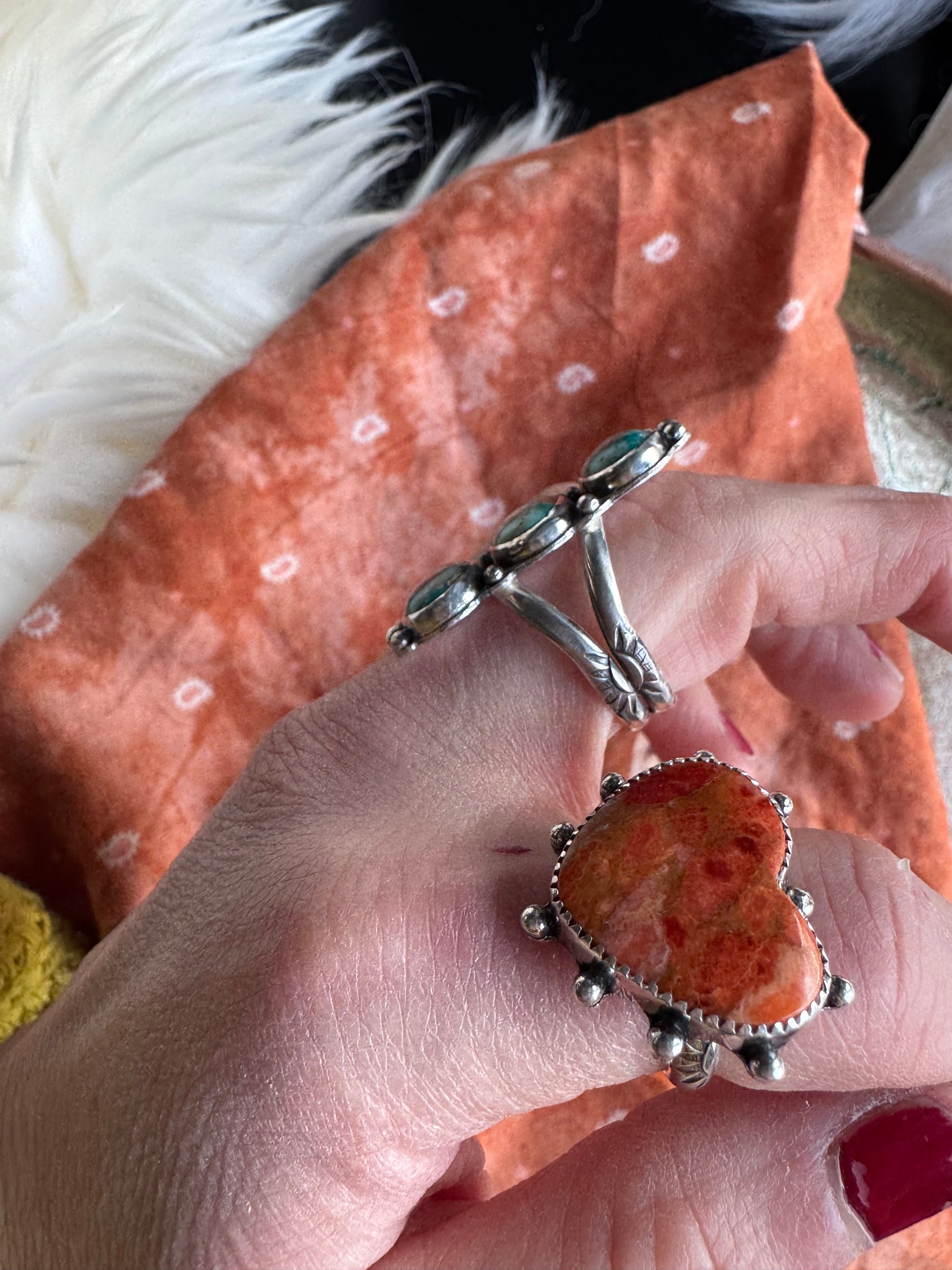 Some of the prettiest teal blue turquoise, this triple stone ring features triple ball bead detail at either end and ball beads between stones. Set on a double split shank hand stamped band.