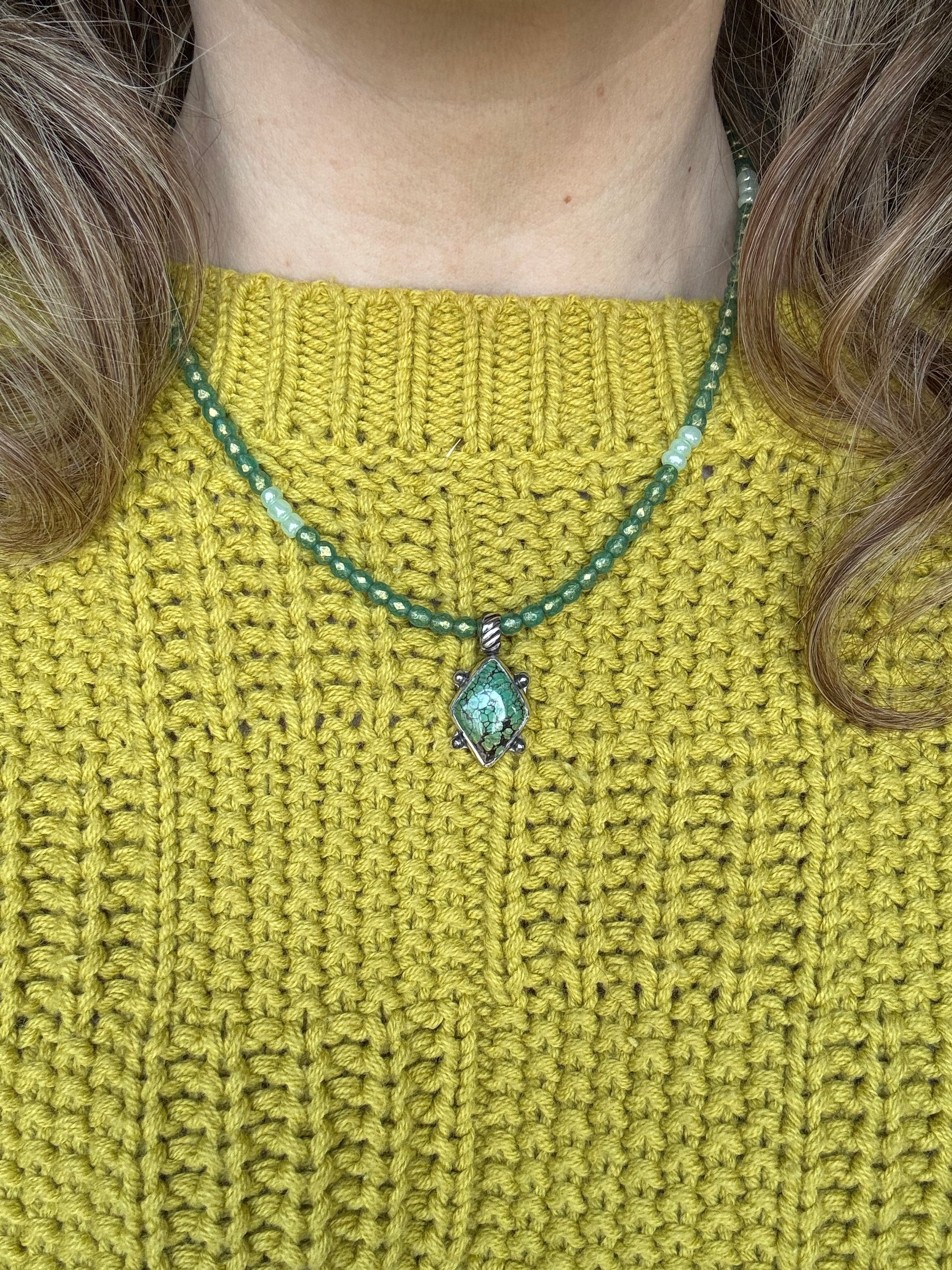 A super pretty green turquoise with lovely earthy brown matrix. This shape is my favorite- its called rhombus, I love the ball detail at the sides.