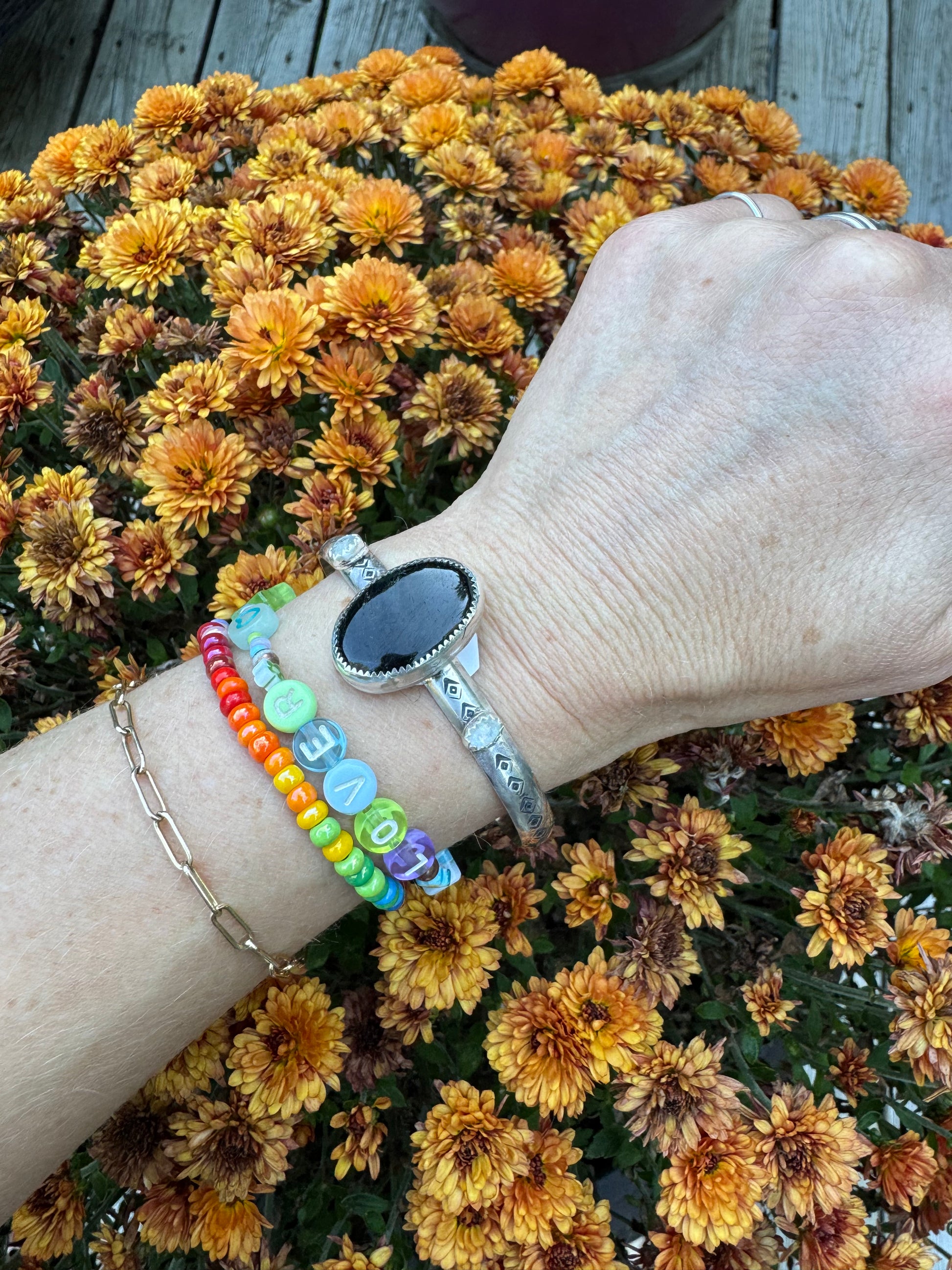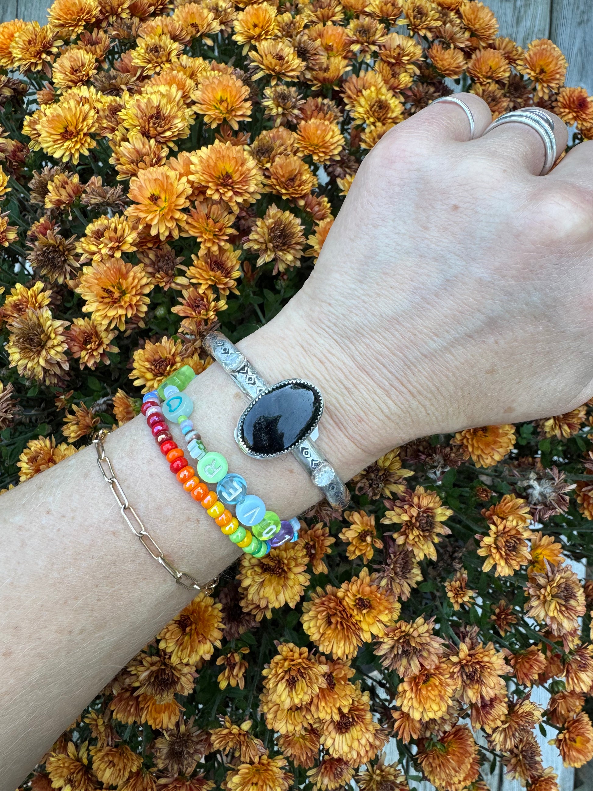 A cuff featuring the blackest of Tourmaline and two small Moonstone