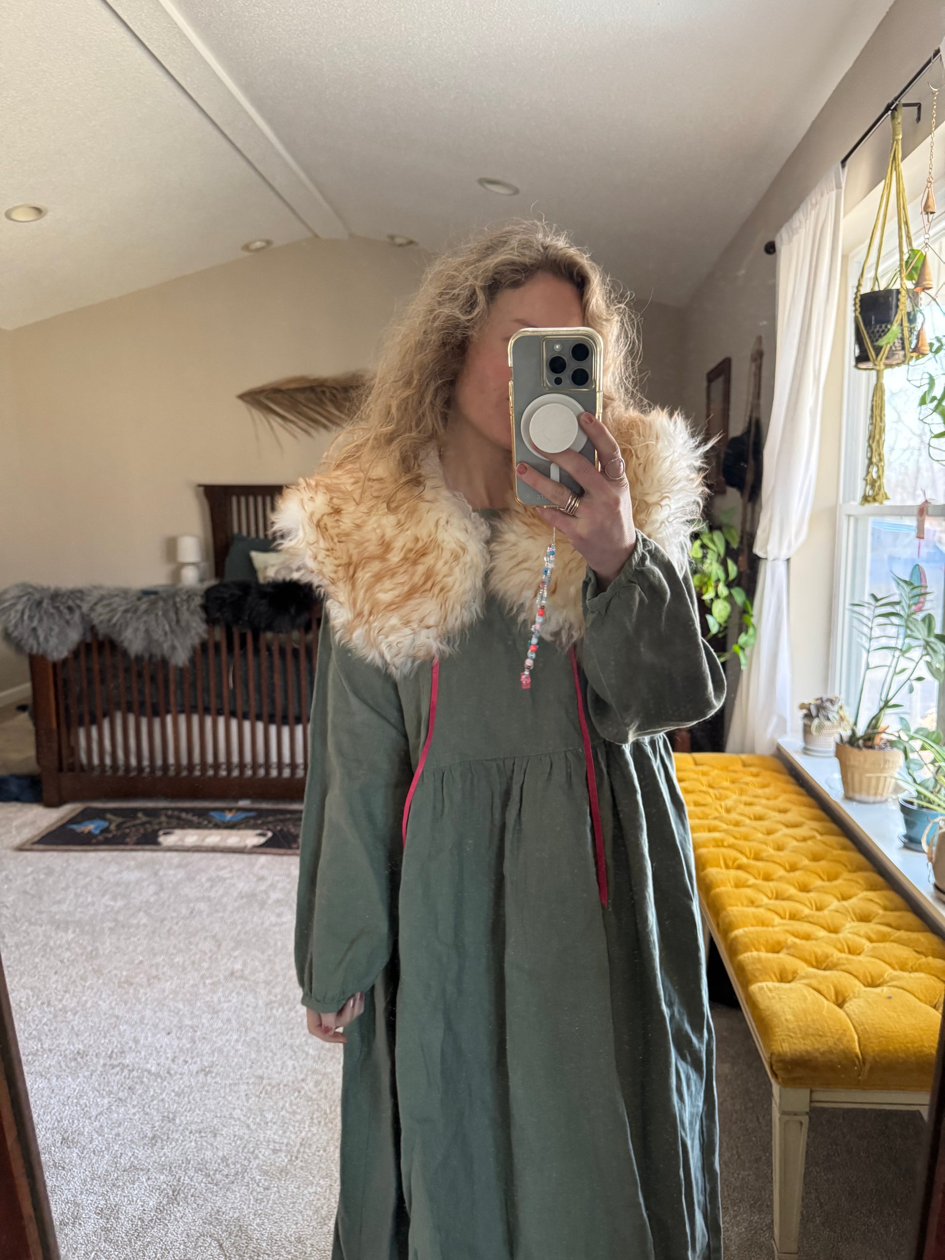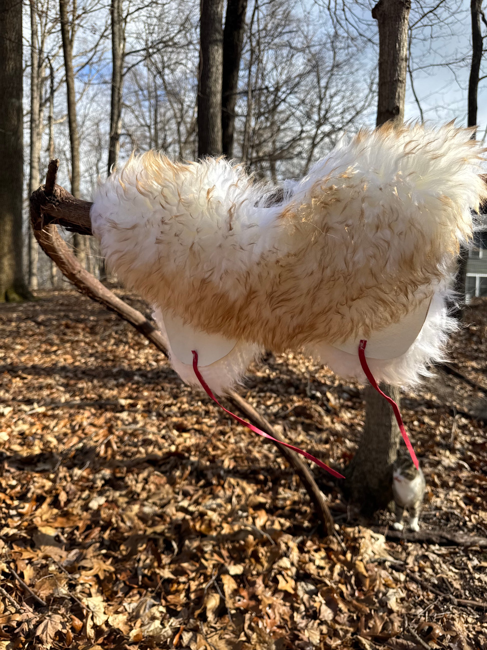 A heavy weight wool collar, made from sustainably sourced sheep hides. Neck ties are pink leather. These collars can be worn with any attire- over your coat, cardigan, sweater, dress, shirt. The wool will keep your shoulders, neck and core nice and toasty.