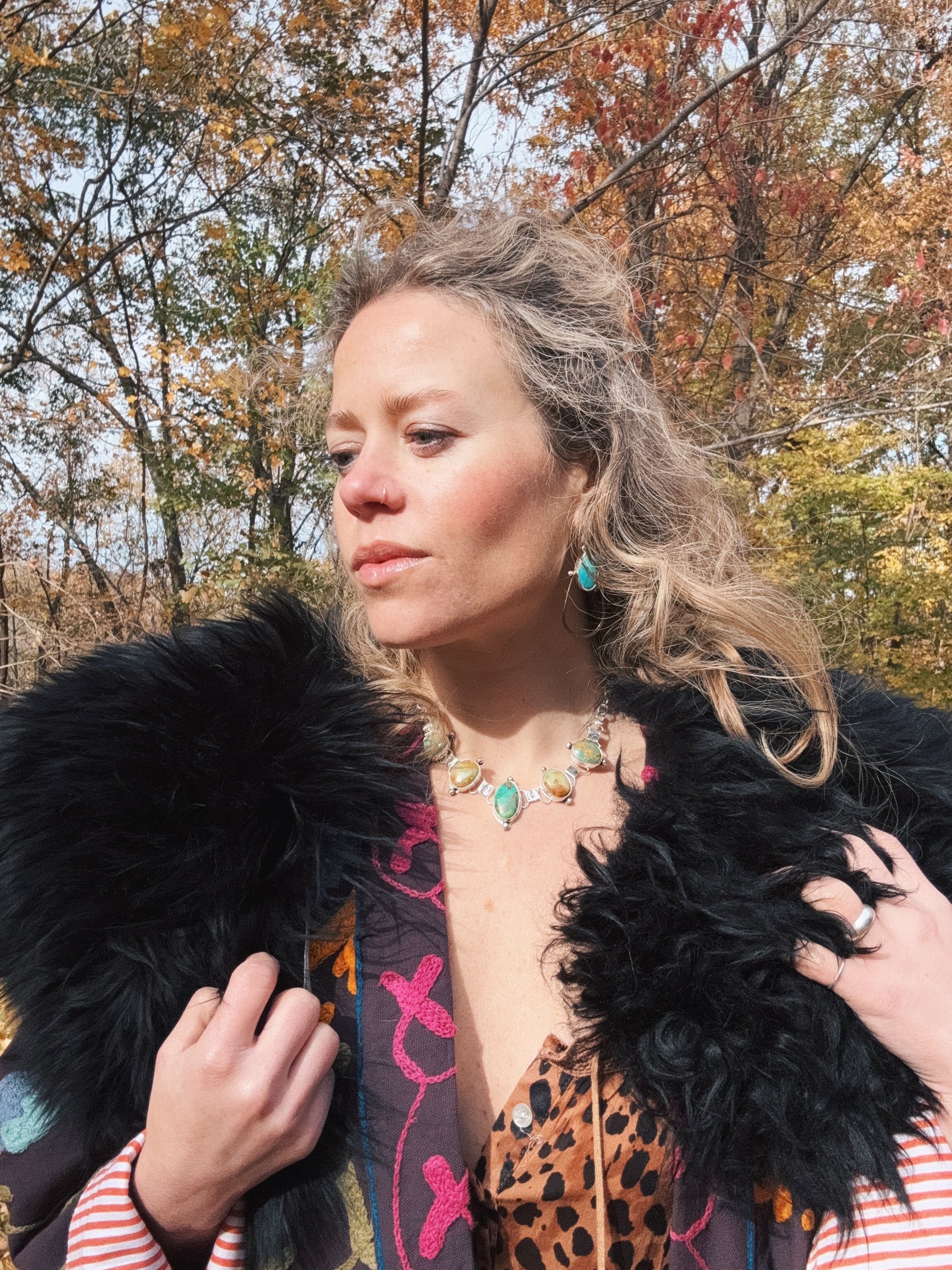 5 Evans Turquoise stones, linked with hand formed fine silver which is stamped with a design. I am obsessed with this look, it lays so beautifully on the chest. Meant to be worn high, just under the neck on the upper chest. Although, it can be worn lower and even tighter! The chain is 17". If you need additional length added- $6/inch. Just email me! Please allow 2 days for this added work.