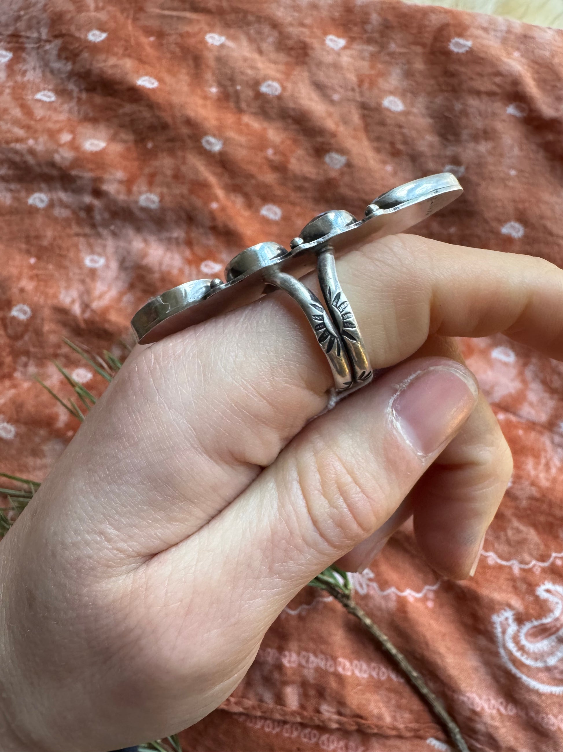 A four stone statement ring, featuring Golden Hills and Campitos Turquoise. LOVE love loooove the blues in this piece. Truly unique. None like it. And she can be yours. Set on a hand stamped double split shank ring.