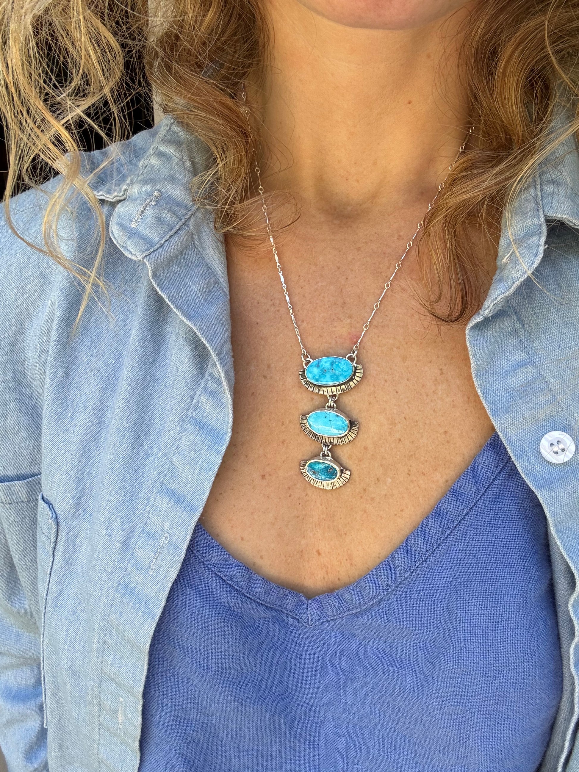 A three tier, cascading turquoise necklace. The reverse holds a message.