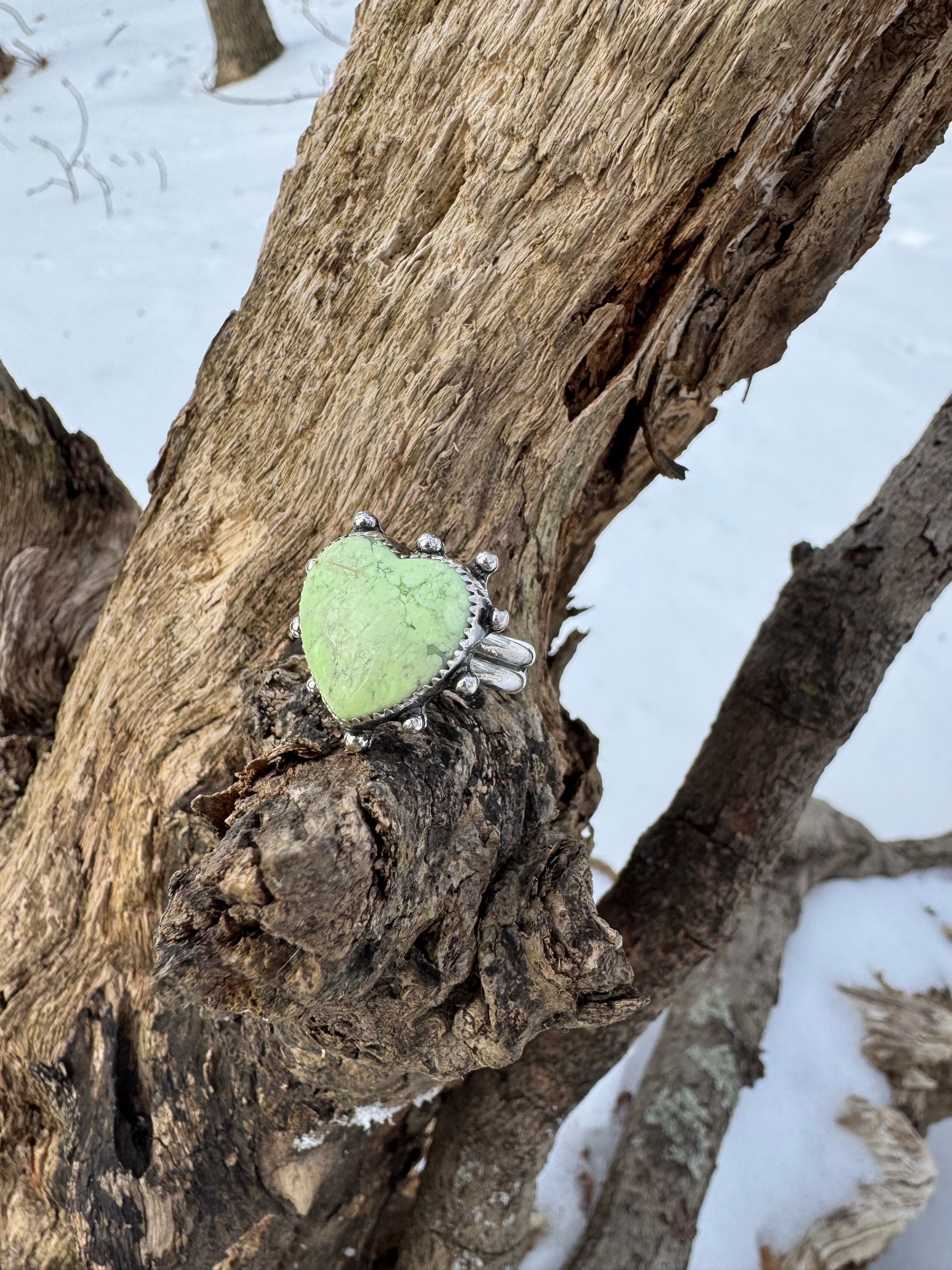 Lemon Chrysoprase Heart surrounded by silver bead balls, set on a double band.