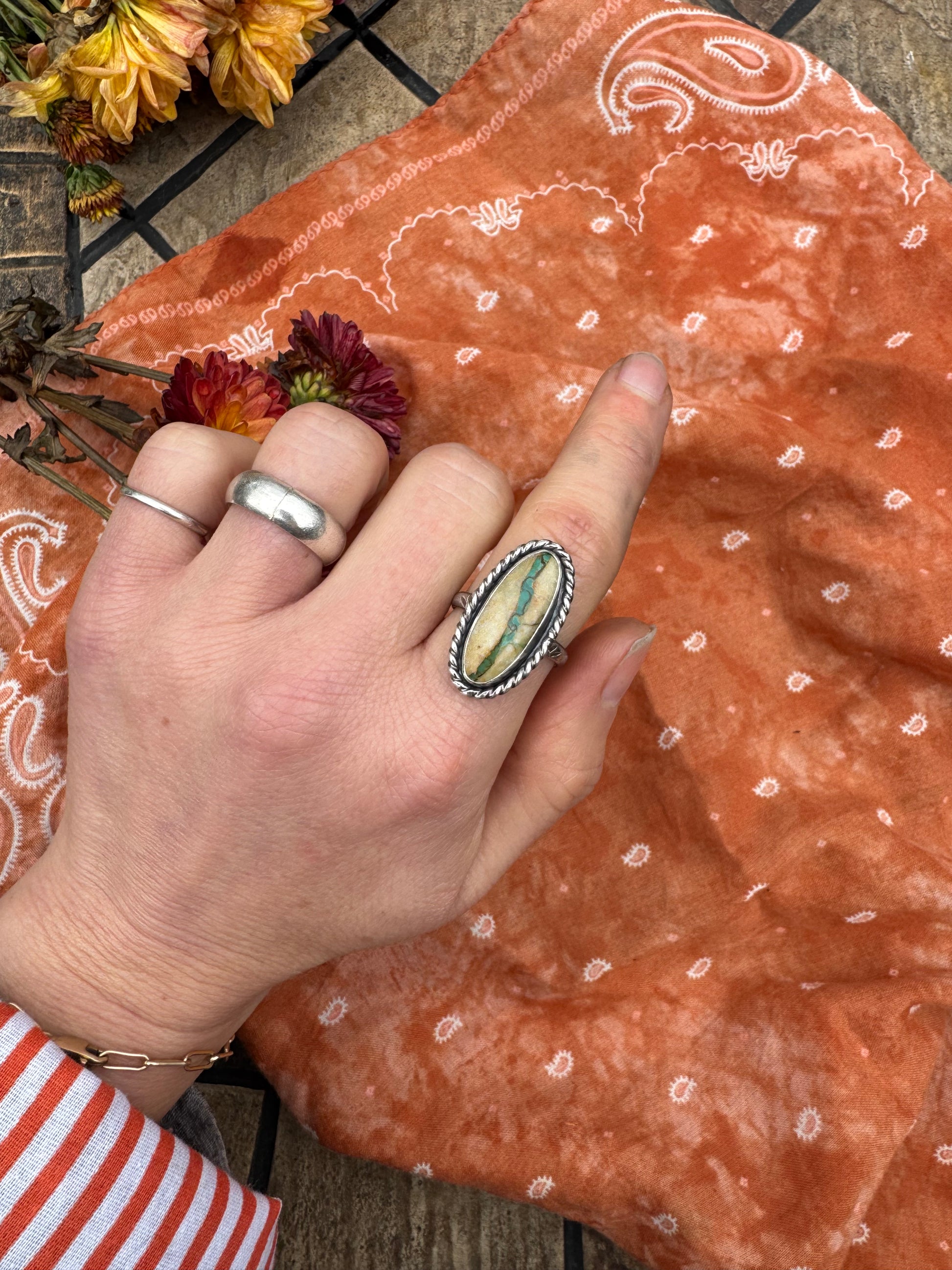 A long oval Royston Ribbon Turquoise. Set on a hand stamped band. All sterling.