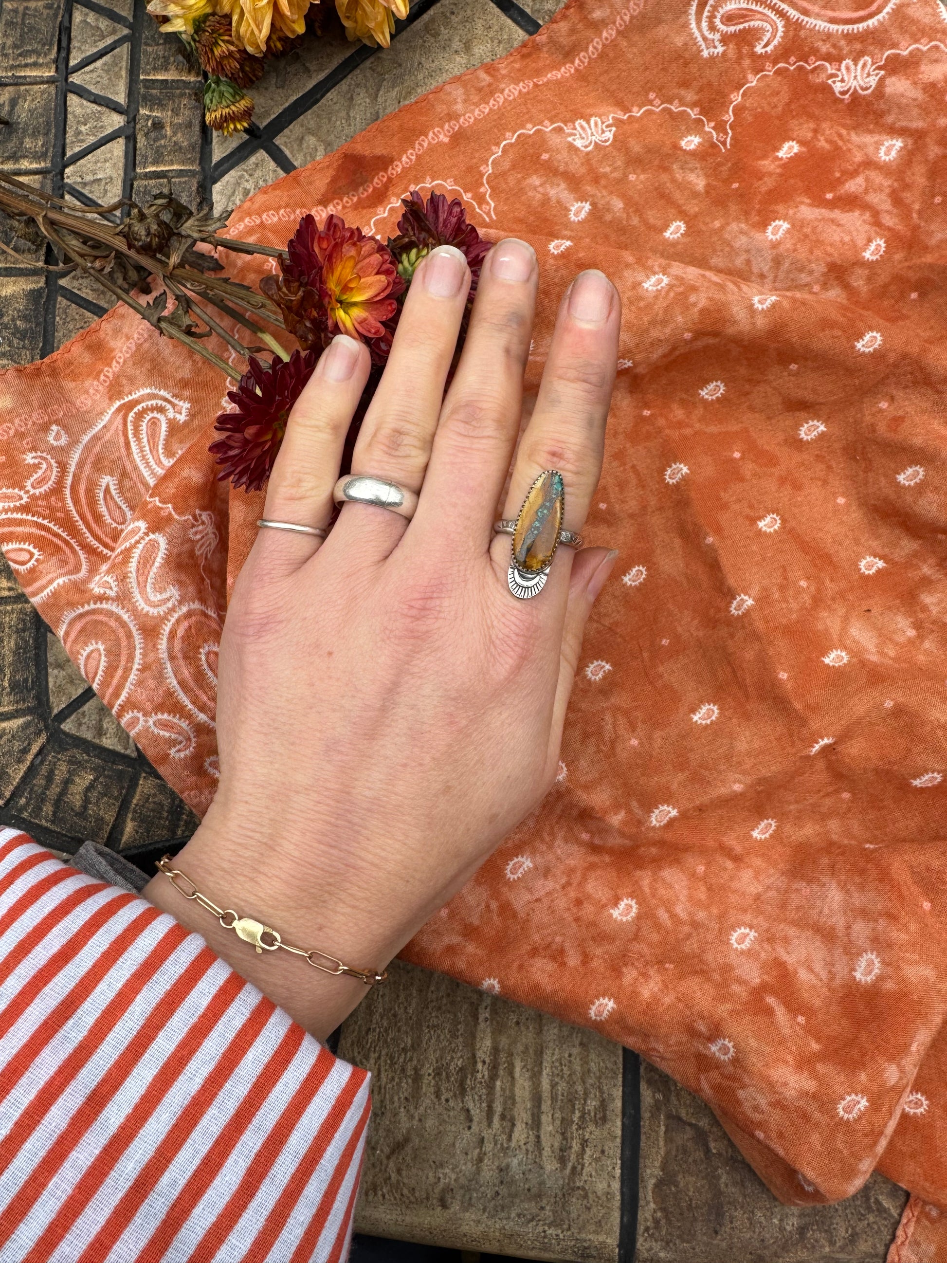 A long Royston Ribbon- a bRowan stone with a green ribbon of turquoise running through it. One of my favorites. Set on a hand stamped band. All sterling.