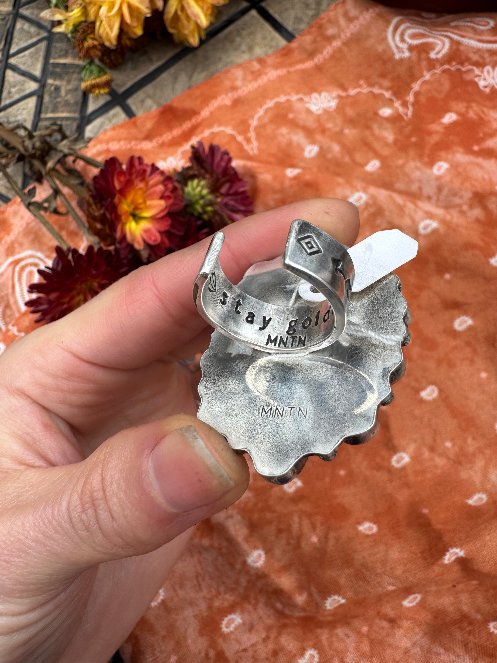 A hefty statement ring. 9 stone make up this piece- 8 turquoise and 1 orange apple coral in the center. I LOVE this statement piece. The wide hand stamped band is open at the bottom, it is a thick band. It is too thick for you to adjust, but it would be adjustable on a mandrel if needed.