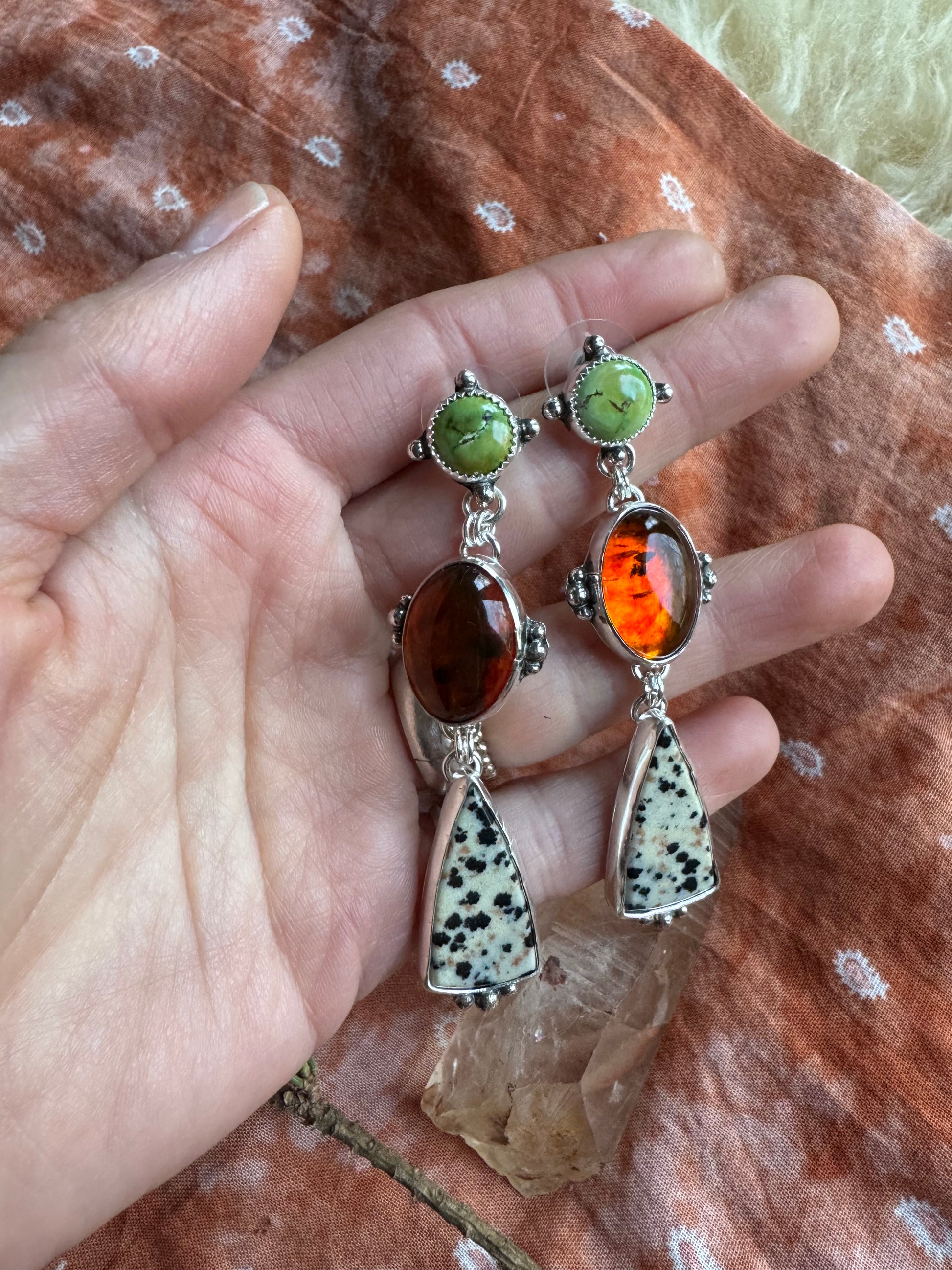 Statement Earrings - Amber + Turquoise + Dalmation stone