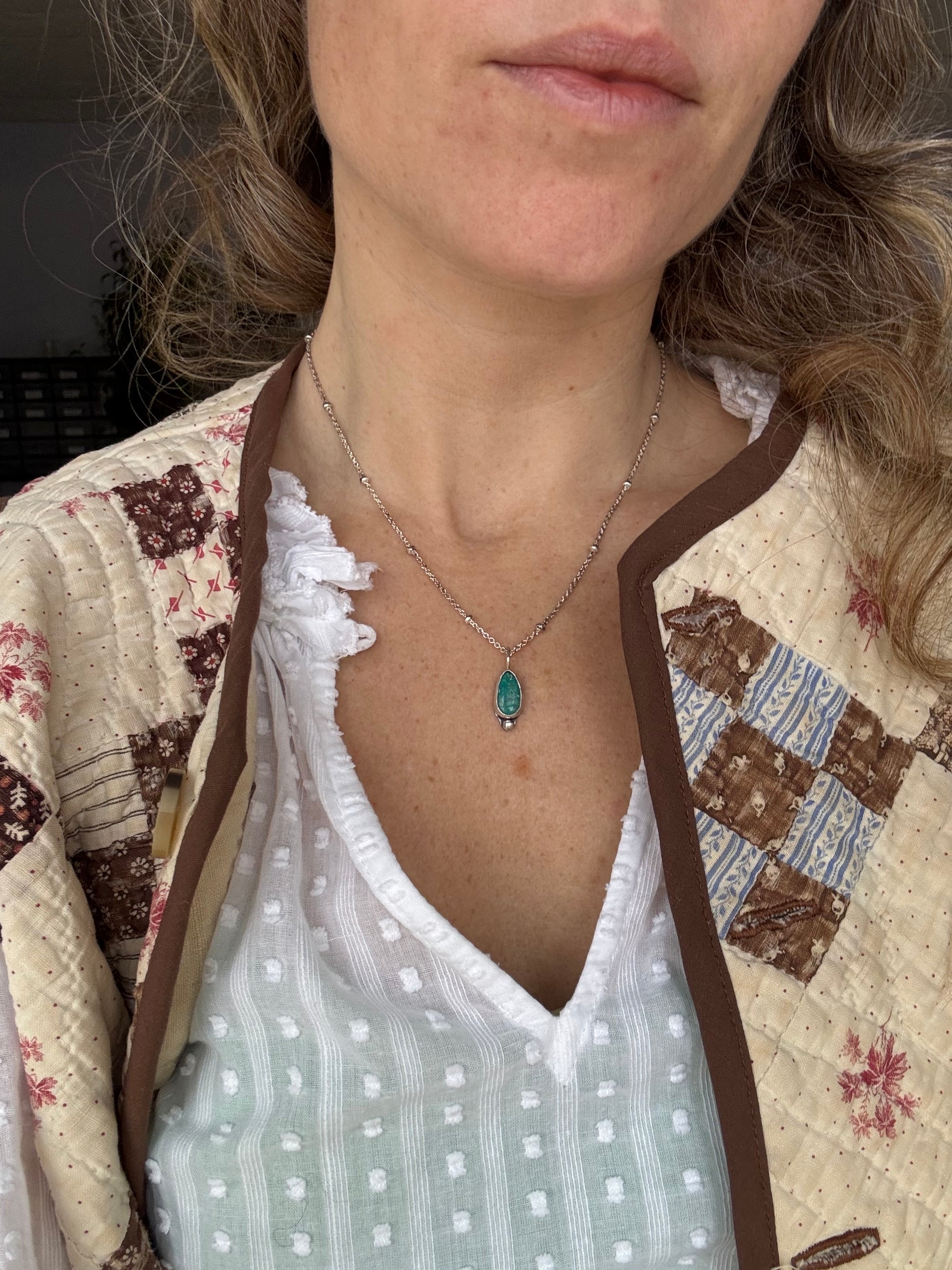 A cutie long teardrop turquoise necklace. Perfect for every day wear. On a 16" chain.