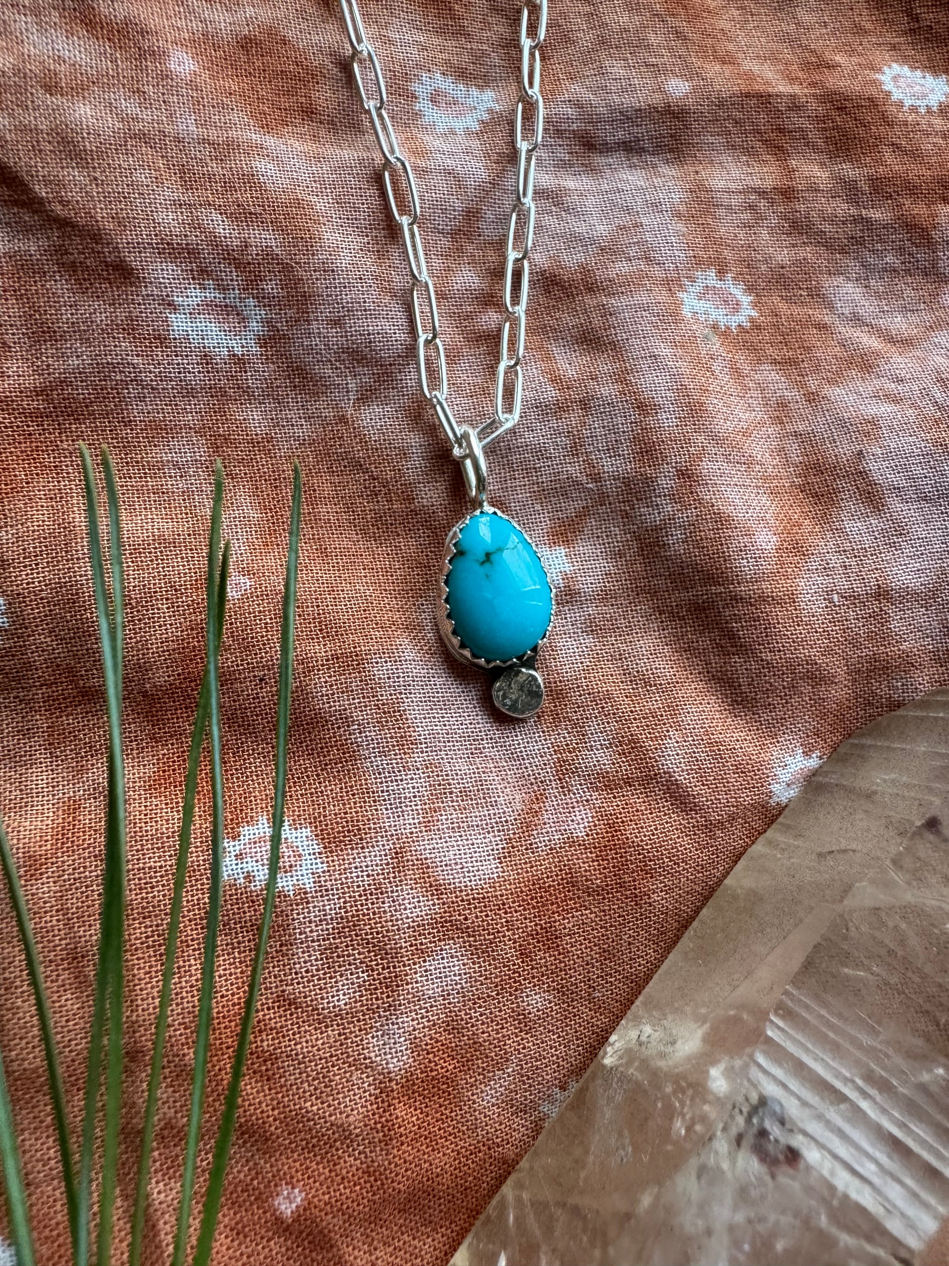 A teardrop blue Turquoise, with a flattened ball detail at bottom. Perfect for every day wear. On a 18" paperclip chain.