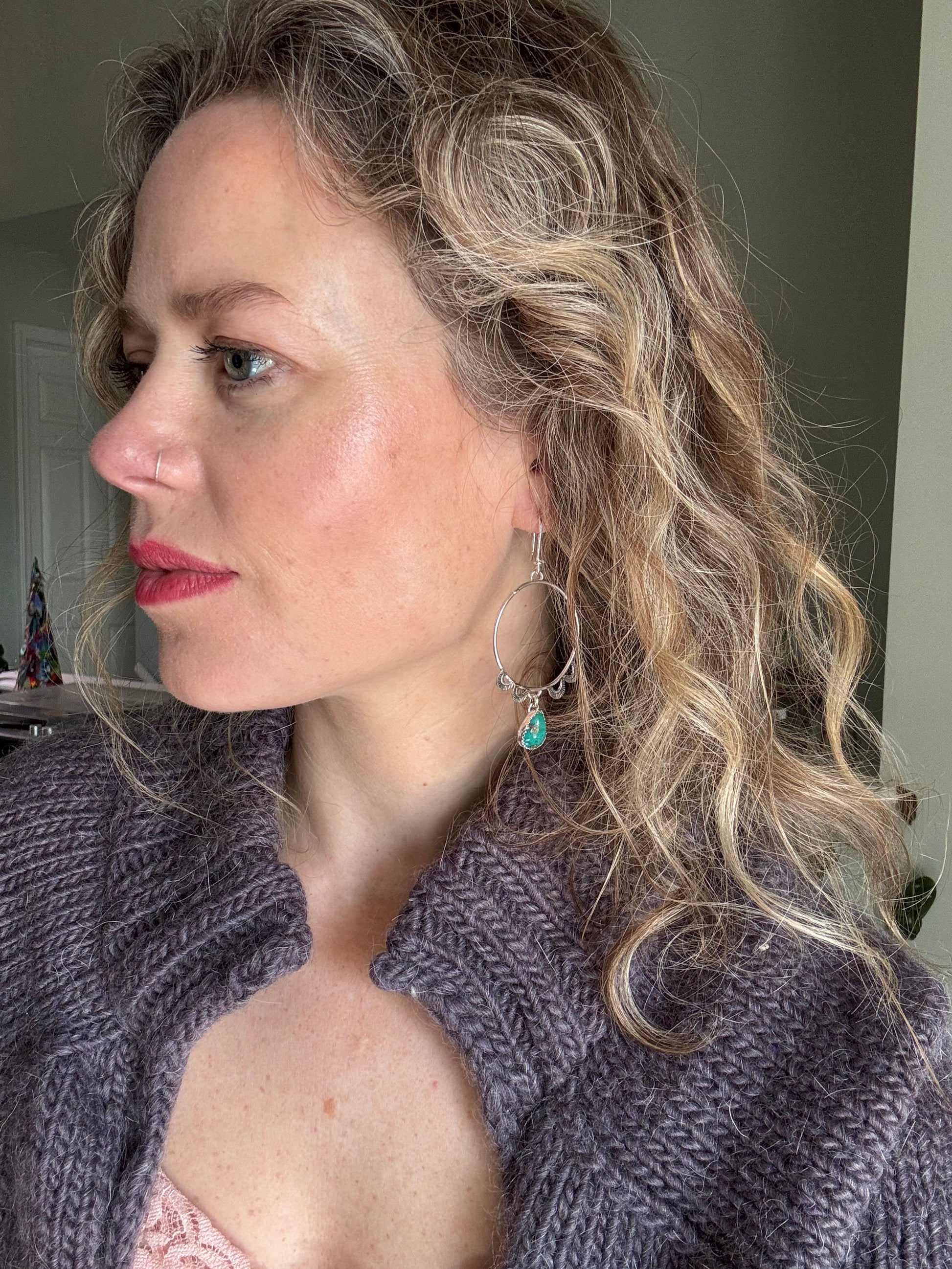 Hoops featuring a dangling Sonoran Gem Turquoise, with 2 sets of hand stamped elements on either side. Love these statement earrings. These are not heavy.
