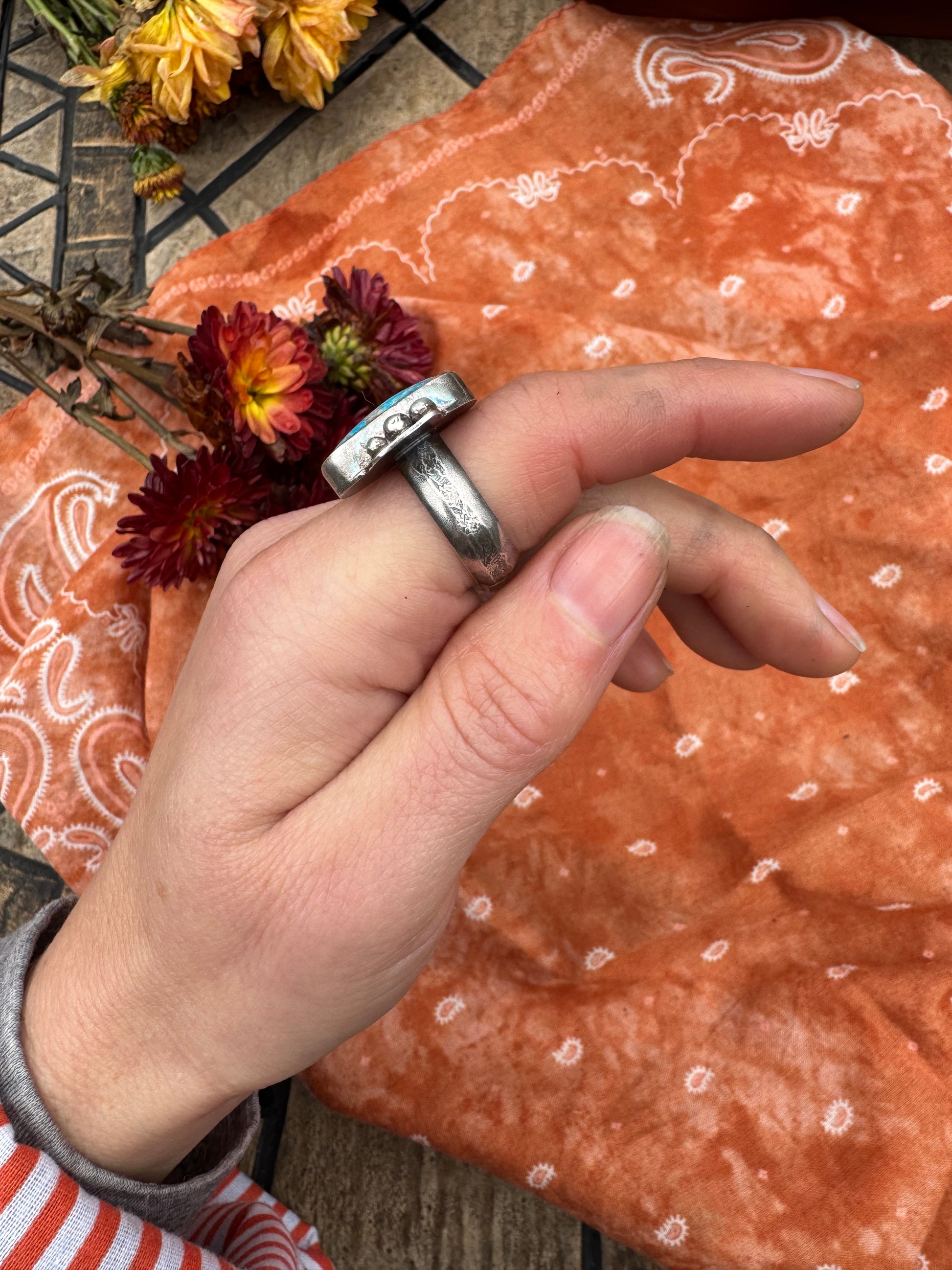 A semi-adjustable turquise statement ring. This ring is open at the top, so it can easily slide over a swollen knuckle, etc. The Turquoise is Tyrone and Kingman. Set on a wide band. All sterling. The inside band says " do the thing"
