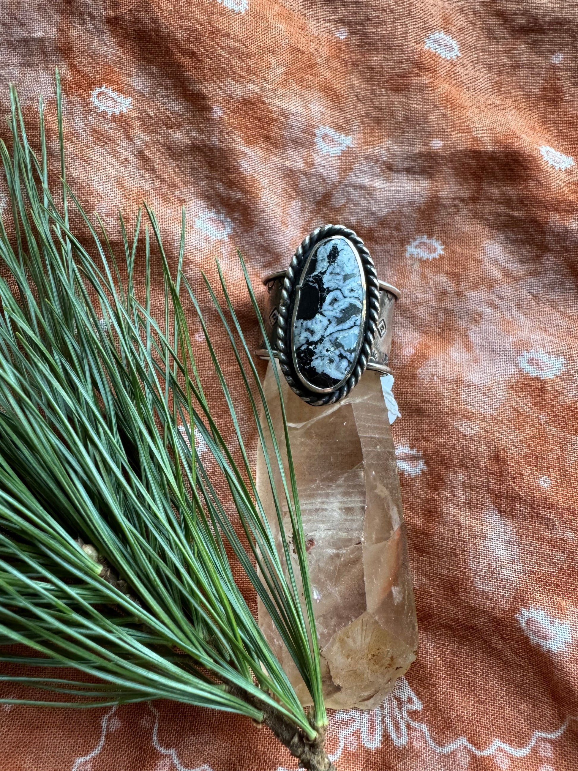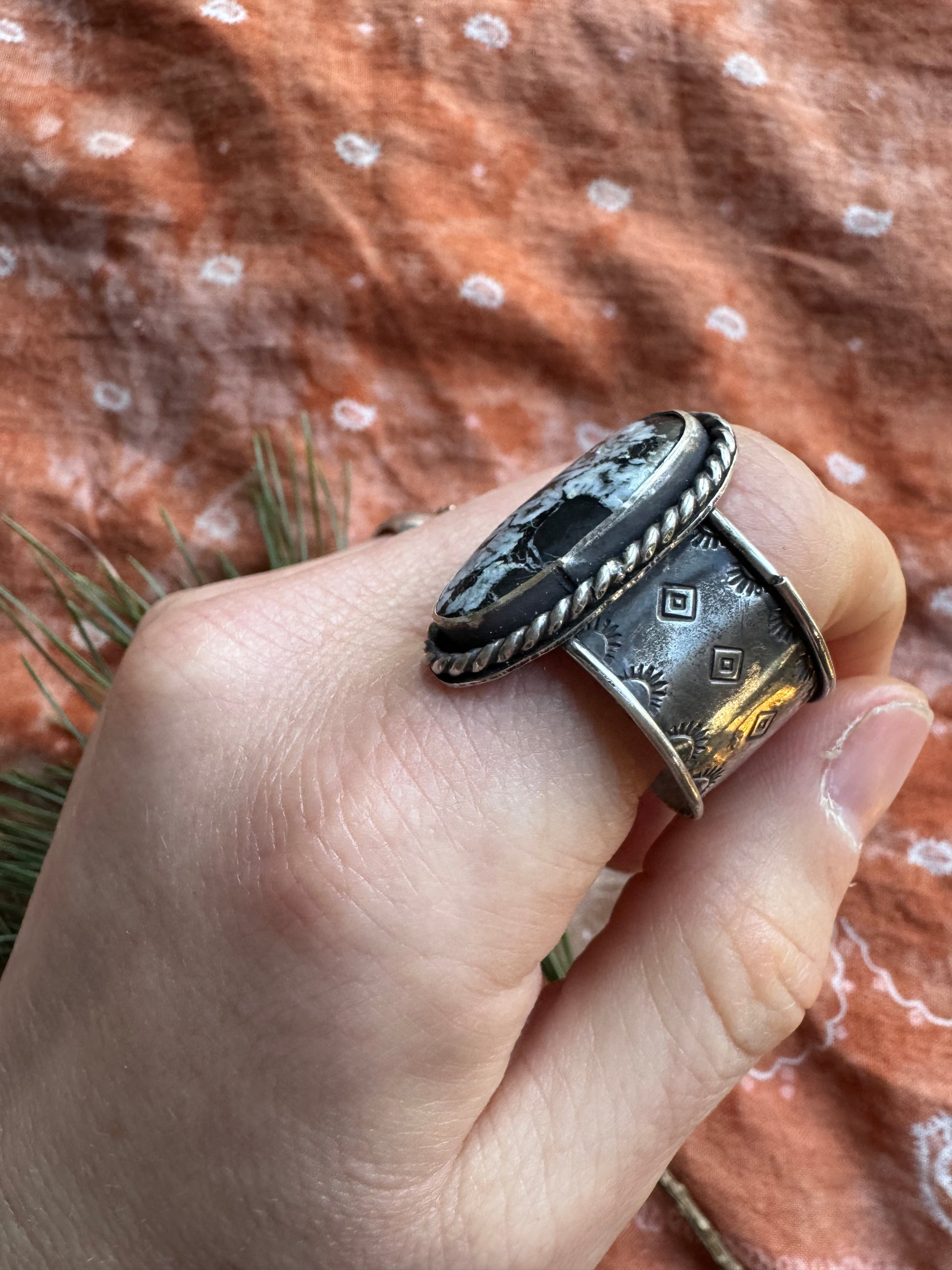 A long oval Kingman turquoise. Equal black and white. Set a very wide unisex style band, hand stamped. Note that the wide band will fit tighter- approx 1/2 size tighter.