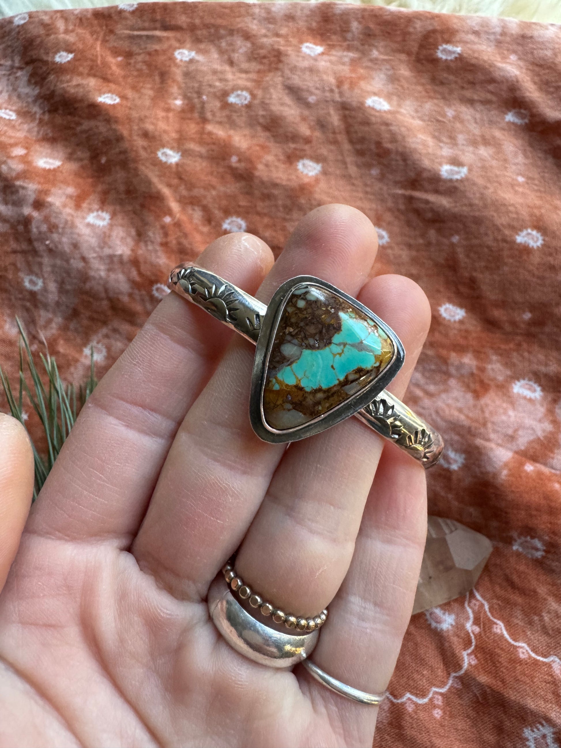A large triangular turquoise with lots of brown matrix. Cuff is stamped with a sun rise design.